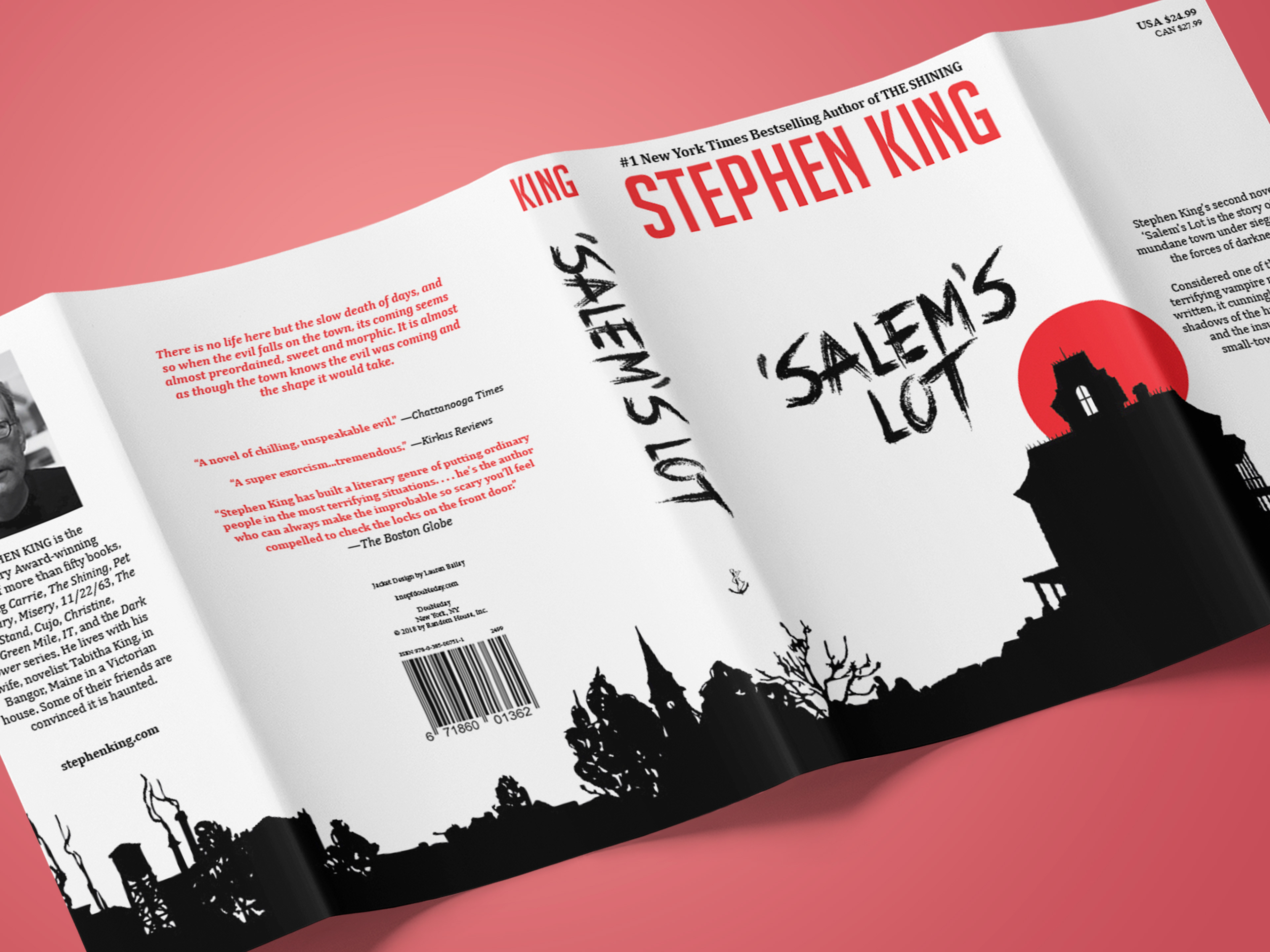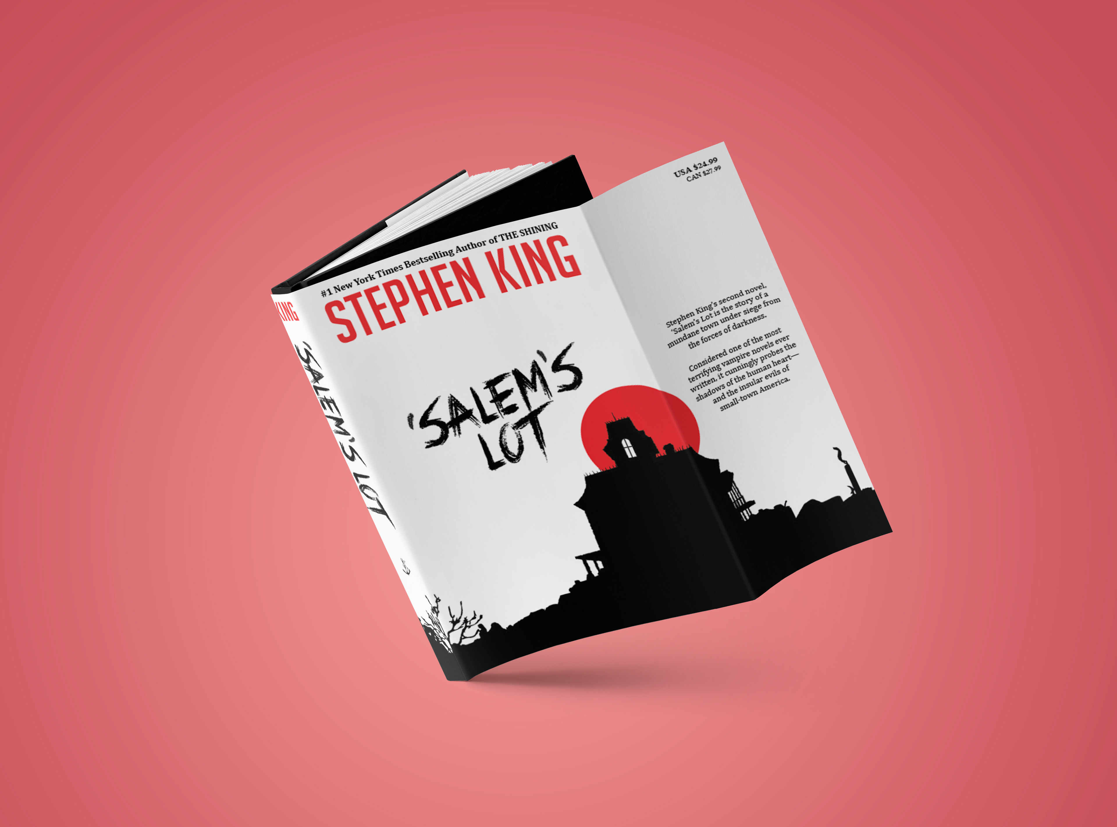 Redesign of a hardcover book dust jacket for Stephen King's second novel, 'Salem's Lot (which happens to be one of my favorite books of all time). The house and town silhouettes were created in Photoshop, then brought into InDesign to finish the layout. I wanted to capture the feeling of brooding menace that permeates the novel, and chose the stark black and white contrast to help with that -- with just a bit of red, like a drop of spilled blood.